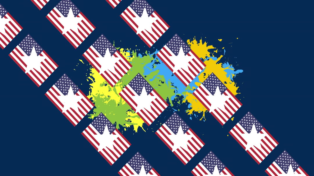 This abstract graphic combines elements of digital network connections with American flag motifs. Vibrant splashes of yellow, green, and blue add contrast against a dark background, suggesting global interaction and technological innovation. Useful for creative illustrations of cyber connectivity, digital communication campaigns, or as a concept art representing international technological integration.