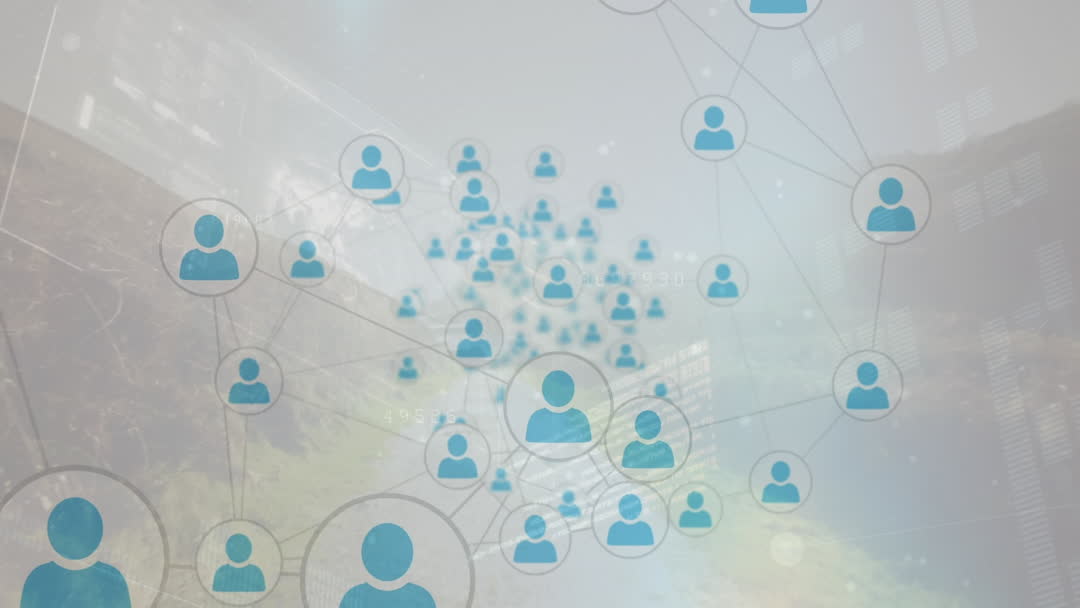 This abstract illustration of a digital network with connected user icons conveys themes of communication, connectivity, and technology. Overlay of road videory implies seamless integration of technology in daily environments. Ideal for use in marketing materials related to technology companies, global business solutions, digital integration, or educational content on networking and data processing.