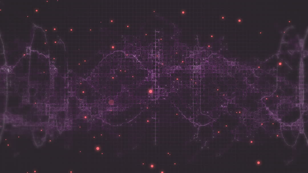 This digital abstract pattern with moving shapes and glowing particles in purple hues suggests a high-tech and futuristic setting. Perfect for use in presentations about technology, data visualization, or digital transformation themes. The dynamic movement adds a sense of innovation making it ideal for multimedia projects focusing on advancement and technology trends.
