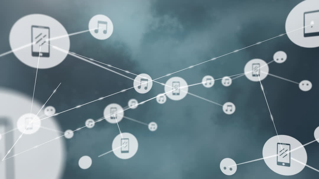 This video depicts an abstract representation of a digital network with interconnected icons of music notes and smartphones overlaid on soft, cloud-like textures. It symbolizes connectivity and technology, ideal for use in presentations, digital transformation projects, tech-themed marketing materials, and any creative communication focusing on tech and online networks.