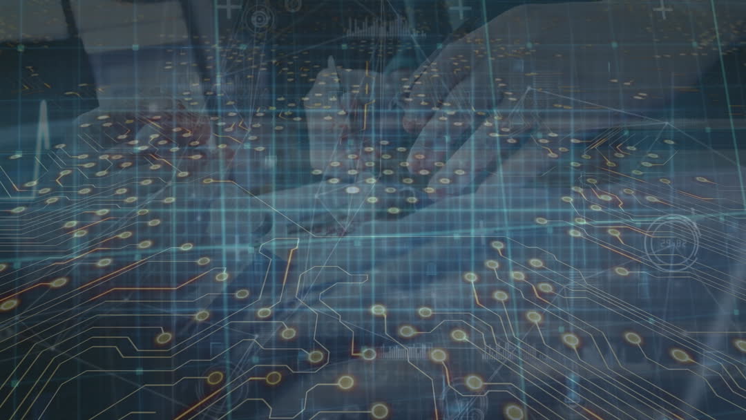 Abstract digital videory merging a circuit board and a network of data connections symbolizes the intersection of technology and healthcare. Appropriate for concepts exploring futuristic medicine, the impact of tech in user data, or digitization in medical industries.