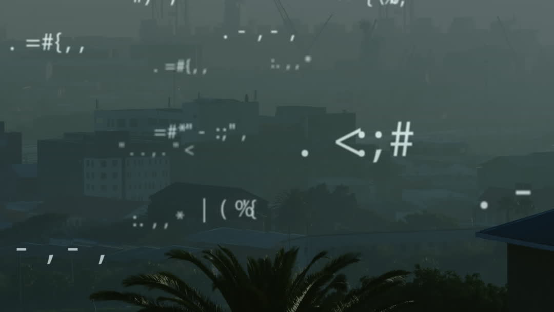 - Abstract Digital Symbols over Misty Cityscape