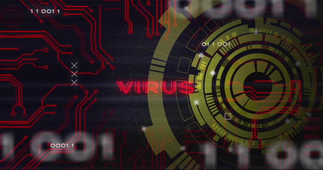 Illustrates cyberspace themes with digital graphics and 'virus' text. Ideal for presentations on cybersecurity, digital threats, or technology news updates. Utilizable in tech blogs and educational material to discuss internet security.