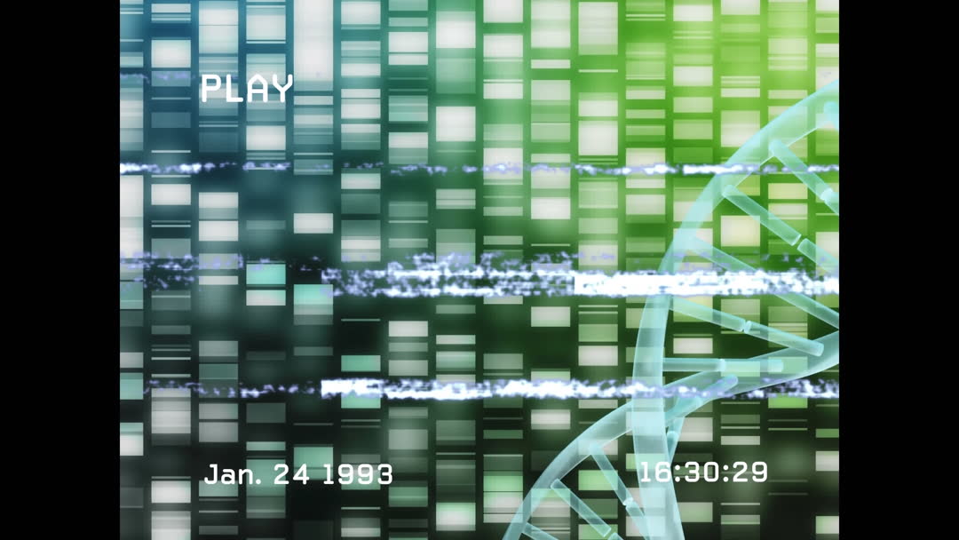 This visual combining elements of DNA strands with a retro glitch effect featuring play buttons and timestamps evokes a nostalgic look at technological advancements in genetics. This can be ideal for vintage-style scientific articles, presentations on the evolution of digital design, or creative technology projects aiming for a retro-futuristic theme.