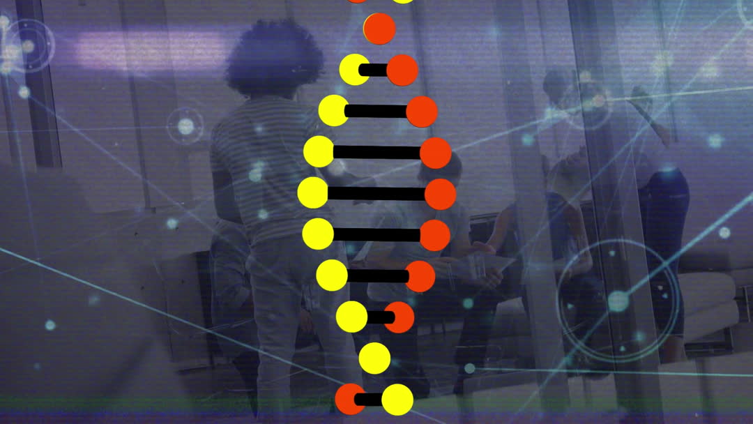 This video combines an abstract DNA strand with a modern office scene featuring business people interacting. The blend of scientific and professional elements suggests a dynamic intersection of biology and technology. Useful for content related to biotech innovation, intersection of industry and science, or corporate innovation strategies. The overlaying patterns emphasize data connections and the merging of digital processes within a business environment.