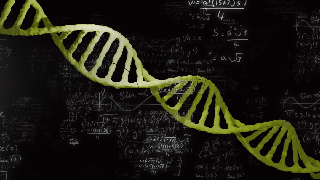 DNA helix intertwines with complex mathematical equations suggesting a blend of genetics and data science. Suitable for educational materials in biology and mathematics. Ideal for illustrating concepts related to bioinformatics, genetic research, and scientific analyses.