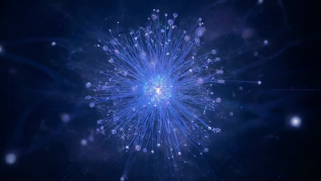 AI Generated Image. Luminous blue core emits radiating filaments of light among drifting particles in a cosmic setting. Represents connections, digital energy, or futuristic technology. Suitable for illustrating concepts in technology, science fiction, or AI. Ideal for use in presentations, animations, or concept art involving abstract themes.