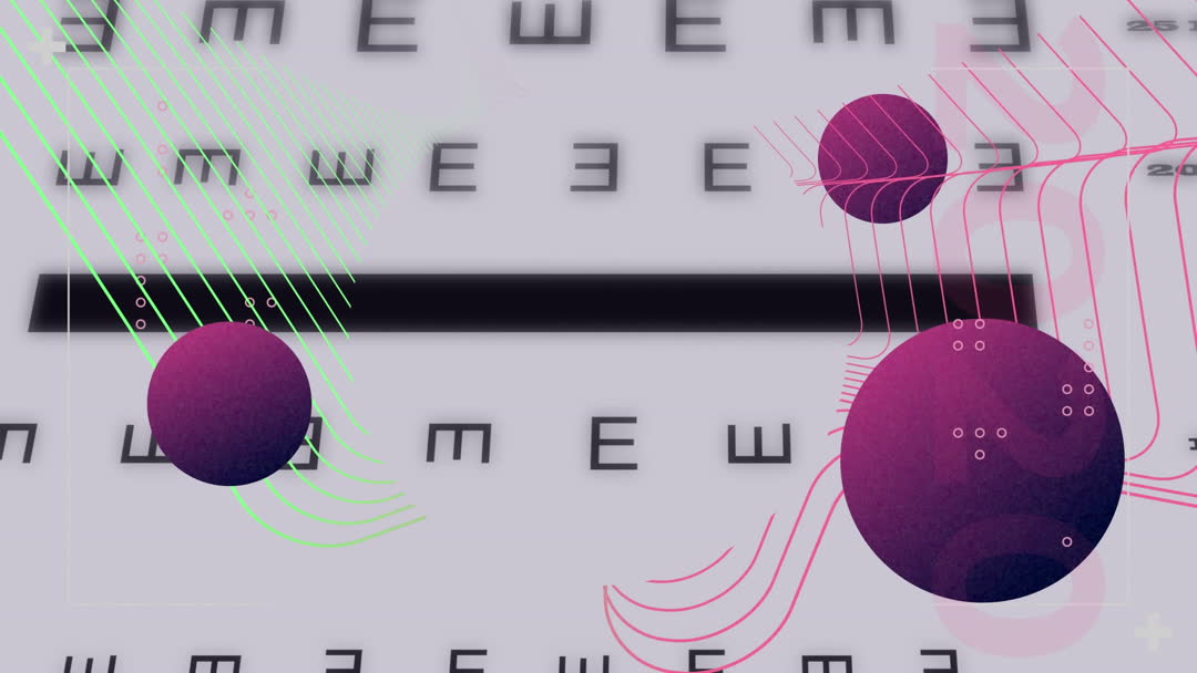 Visualization creatively combines traditional eye test chart elements with modern digital graphics. With abstract pink spheres and virtual lines, ideal for content on healthcare advancements, anywhere the intersection of vision testing and technology is relevant.