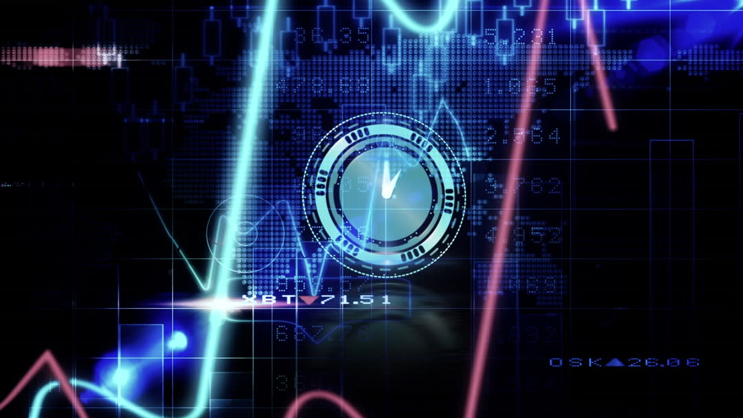 Features digital animation of a fast-moving clock overlay on a futuristic background of grids and financial data. Suitable for using in presentations on global business trends, econometrics, or technology advancements. Useful for illustrating the concept of fast-paced financial markets and data-driven business environments.