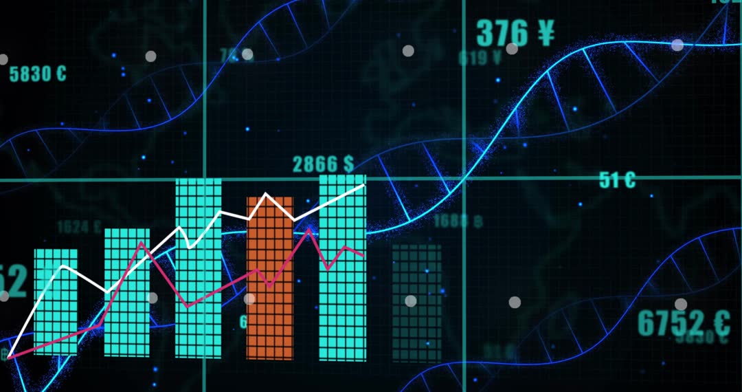 This graphic visualizes financial trends through dynamic data representations and digital DNA helixes. Its futuristic design makes it suitable for illustrating the intersection between technology and finance. This could be used in presentations, financial tech reports, or industry publications to communicate complex data ideas visually.