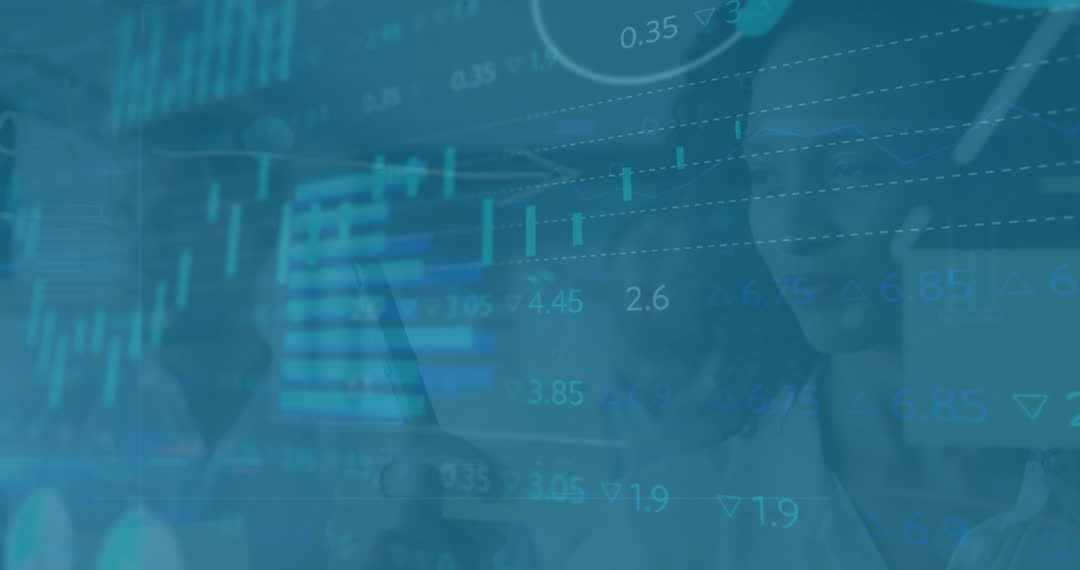 Abstract animation features financial data overlays with graphs and numbers while diverse business people in an office background suggest contemporary digital finance themes. Ideal for illustrating concepts of data processing, global finance, stock markets, technological advancements, or digital economies in marketing materials or financial business presentations.