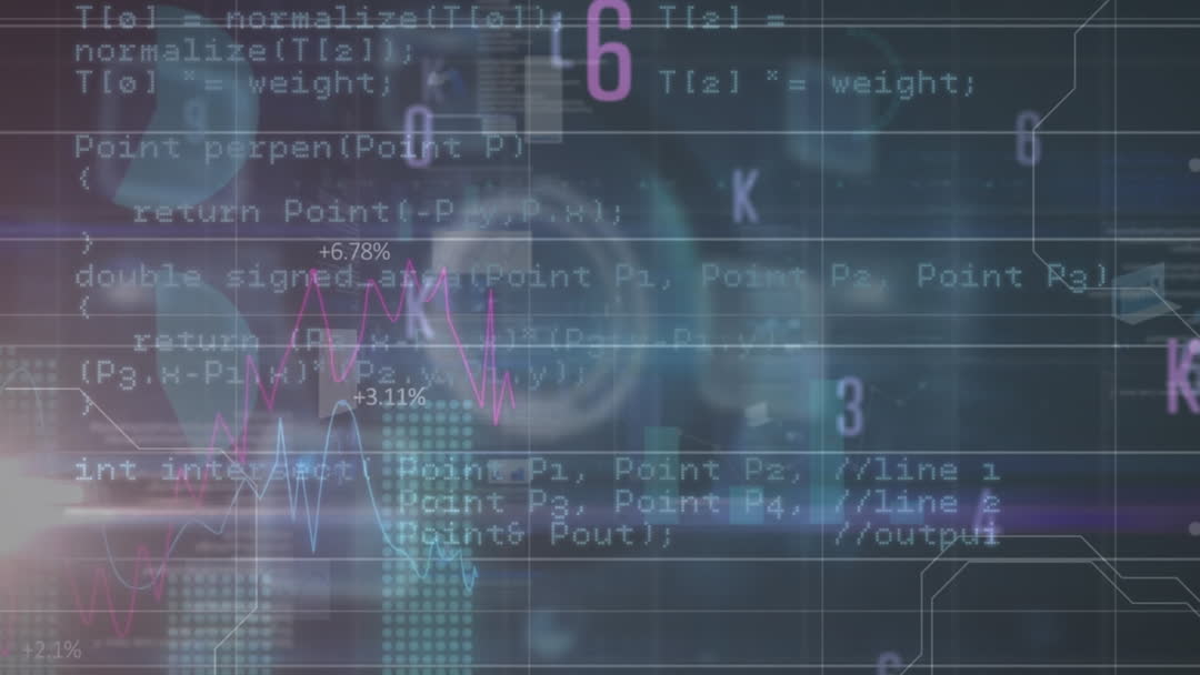 Digital artwork displaying intertwining financial data, program code, and numbers. This conceptual video embodies modern financial analysis and global business computations, ideal for illustrating topics in finance, corporate presentations or tech-related articles.