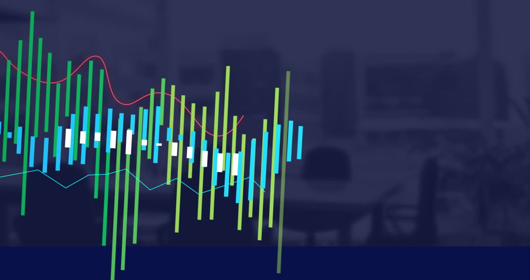 Abstract representation of financial data overlaid against a background of an office setting. Vertical and horizontal lines depict dynamic financial statistics and analytics, ideal for illustrating financial services, investment presentation backgrounds, or economic trend analyses. The contrasts in the visual with popping color lines against subdued office décor can be used in business reports, slideshows, and digital marketing related to economics and technology transformations.