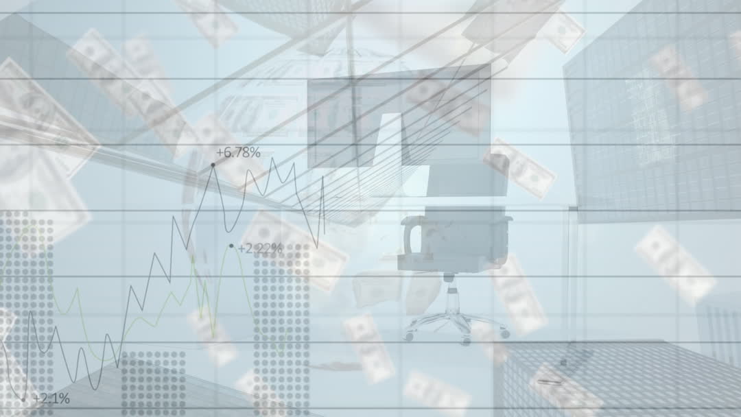 This visual offers an abstract representation of financial data overlaying a modern cityscape and an office with a chair. Useful for presentations on financial analysis, economic forecasts, or the integration of business technology. The layer of graphs and rising percentages suggest growth or analysis, making it suitable for finance and corporate communication materials.