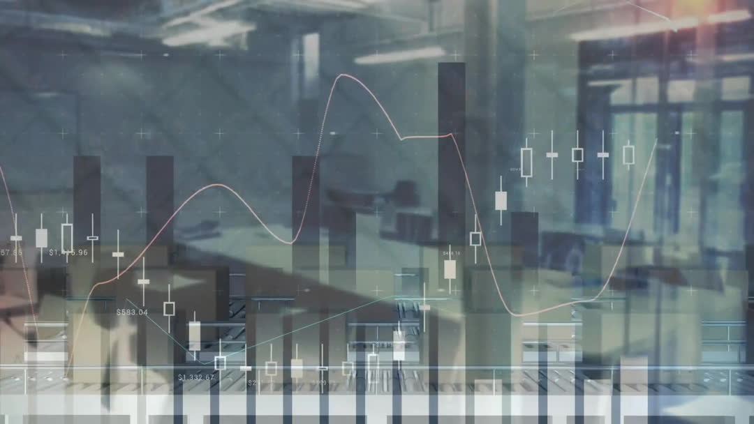 Abstract Financial Data Overlapping Modern Office Setting Video