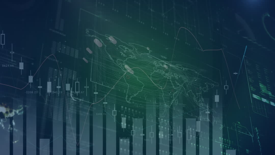 Visualization captures an abstract representation of global financial data trends featuring a world map, charts, and graphs. Useful for illustrating concepts in finance, investment, global markets, and economic analysis. Suitable for use in presentations or on websites related to business, investment, technology, and analytics.