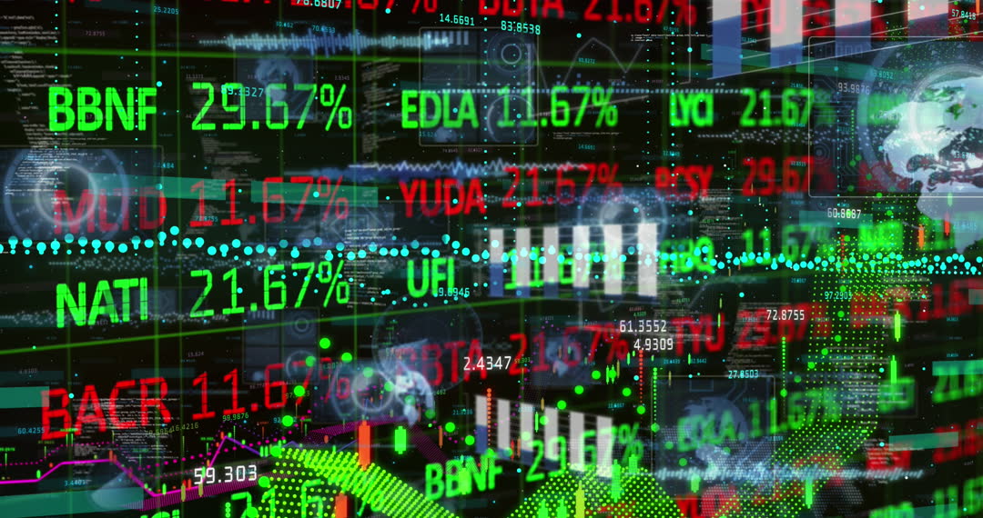 Dynamic depiction of stock market statistics featuring percentages and text running across a black background, implying high-speed data processing typical of financial analysis platforms. Useful for themes related to finance, stock trading, data visualization, and cutting-edge technology.