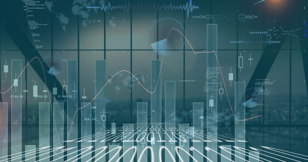 Depicts animated charts and statistics layered over a city skyline, representing financial analysis and global business insights. Useful for illustrating economic growth reports, business planning applications, and educational content on financial markets.