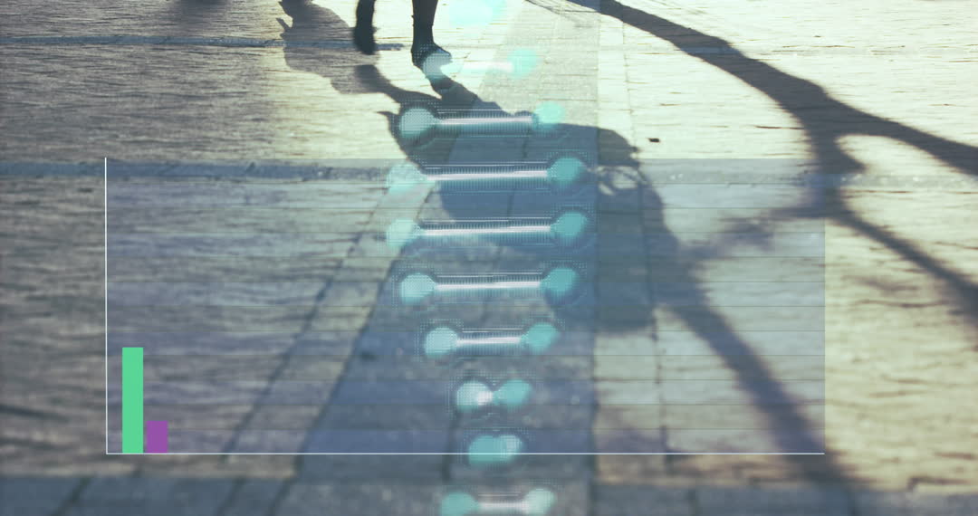 Abstract scene featuring animated purple light flares over a city street at sunset with conceptual graphics of bar graphs reflecting connections in sports and global data processing. Ideal for illustrating themes around fitness technology, urban connectivity, and modern digital integration.