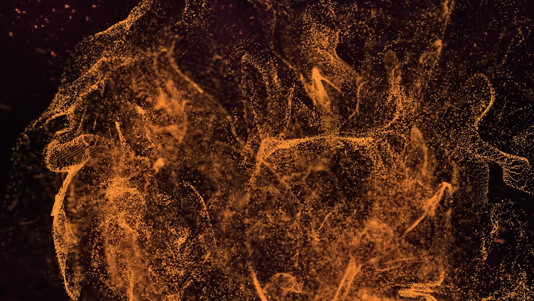 Glowing orange particles intertwine with animated falling snow against a dark background, creating a mystical abstract scene. This artwork is perfect for use in digital interfaces, holiday-themed projects, and festive promotional materials. It evokes a sense of wonder and enchantment, suitable for websites, advertisements, and event invitations involving winter or Christmas themes.