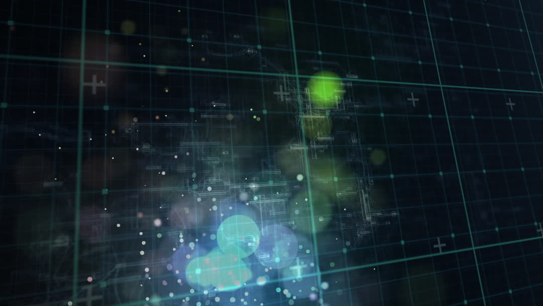 Abstract, futuristic animation displaying a digital data flow on a grid pattern with glowing elements and data markers. This visual portrays advanced technology concepts, making it ideal for technology presentations, data visualization projects, innovatiove tech backgrounds, and informational videos in digital transformation sectors.