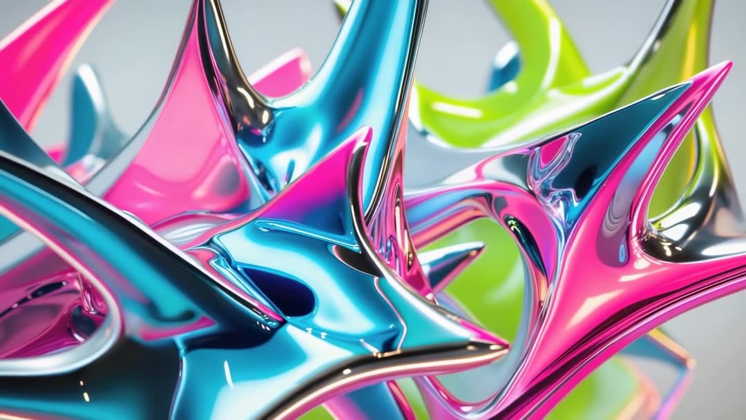 AI Generated Video. This digital art piece features a metallic sculpture with striking cyan, magenta, and lime spikes intertwining in an abstract, geometric design. The highly reflective surfaces offer a futuristic aesthetic, making it fitting for use in digital projects focused on innovation, technology, or art. This visual can enhance any modern set design, creative presentations, or marketing materials for design-related products.