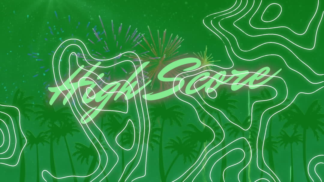 Abstract design featuring 'high score' text with dynamic neon overlay lines. Surrounded by palm tree silhouettes and colorful fireworks. Ideal for use as a gaming background, overlay for online streaming, theme design for electronic gameplay, or a motivational digital platform highlight.