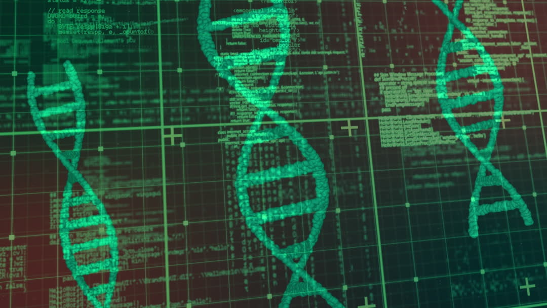 Depicts digitally rendered DNA strands interwoven with abstract data representation. Ideal for use in scientific publications, educational material focusing on genetics and data integration, presentations on biotechnology and research innovations, or visual content in tech-savvy and science-centered media production.