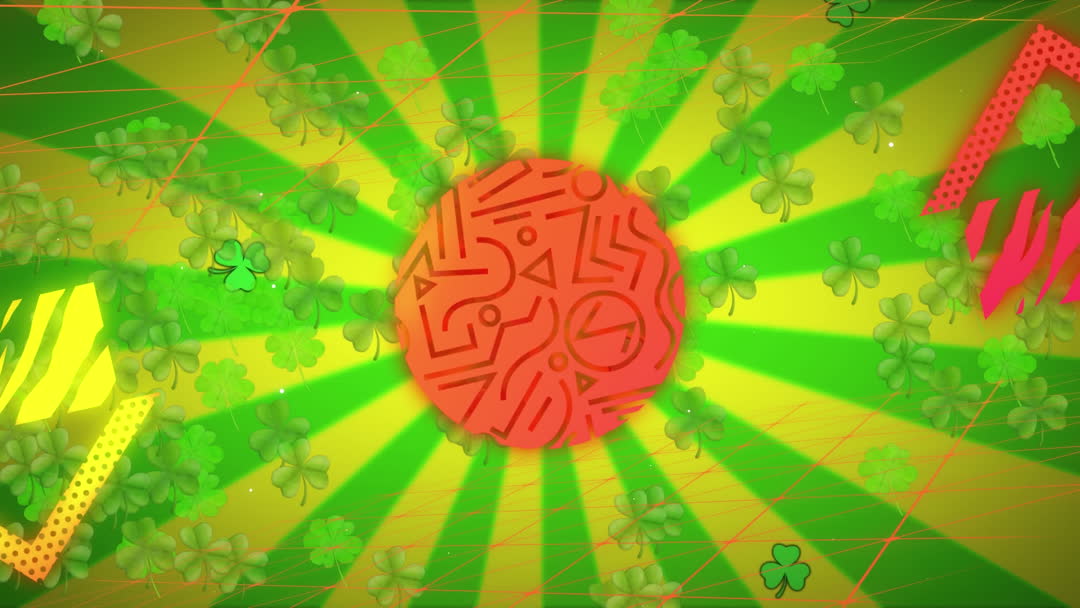 Colorful animation features intersecting rows of geometric shapes amidst vibrant clover leaf patterns on a lively green and yellow backdrop. Perfect for design inspiration, creative projects, or festive themes inviting exploration and playfulness.