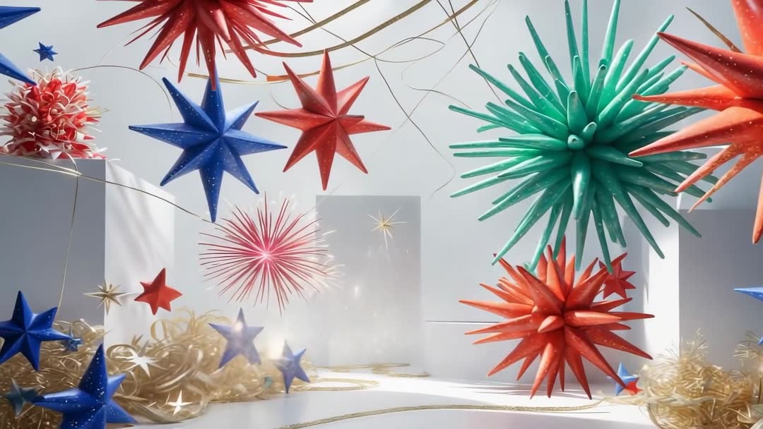 AI Generated Image. This vibrant scene captures a dynamic art installation featuring abstract, geometric stars in red, green, and blue. Ribbons elegantly weave through the display, emphasizing the contemporary and minimalist aesthetic. Suitable for use in design concepts and creative projects focused on modern art, the video sparks ideas with its lively and colorful elements.