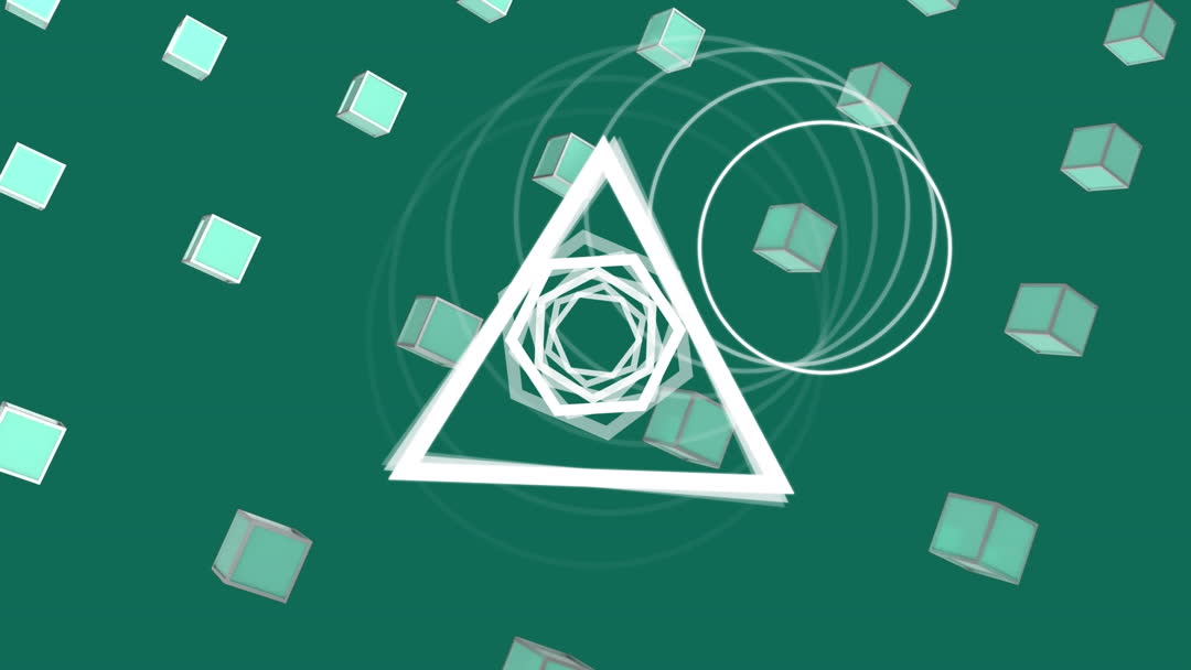 Intriguing blend of triangular and circular patterns intermingled with floating 3D cubes against an aqua backdrop. Ideal for technology, sci-fi, or digital art themes. Suitable for use in presentations, digital advertisements, or backgrounds in animations emphasizing modern design.