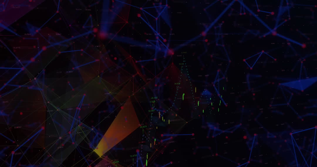 Dynamic animation featuring floating geometric shapes and financial graphs against a dark backdrop symbolizes concepts of finance, data processing, and internet security. Useful for websites or presentations related to fintech, technology, virtual networks, and cyber safety. The visualization can enhance graphics in online platforms like financial newsletters, technological conference presentations, or cybersecurity related content while drawing attention to the intersection of data and technology.