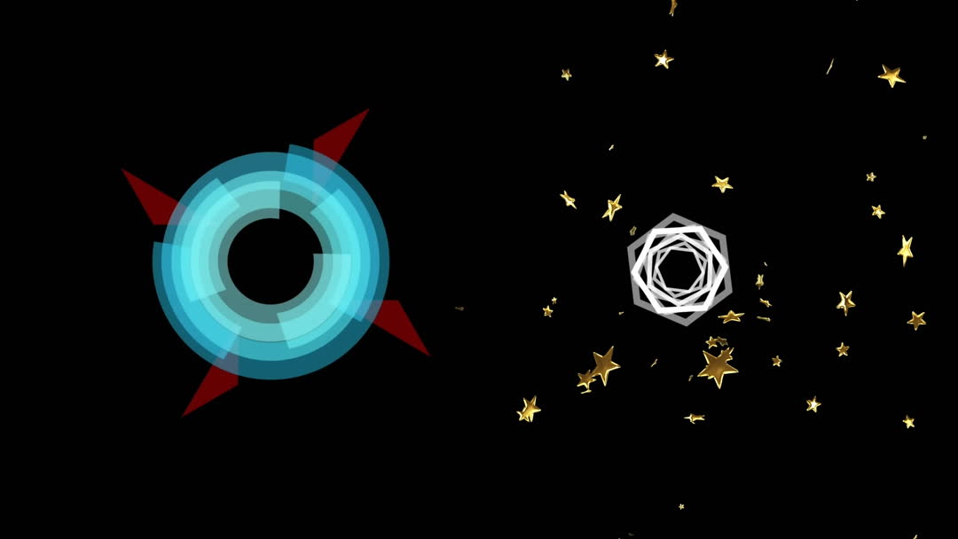 Vibrant animation featuring geometric shapes interplaying with golden stars on a black background. This visual representation is ideal for projects related to digital design, motion graphics, and modern art displays. Use it for advertising campaigns, technology-focused content, or as a creative contemporary artwork illustration.