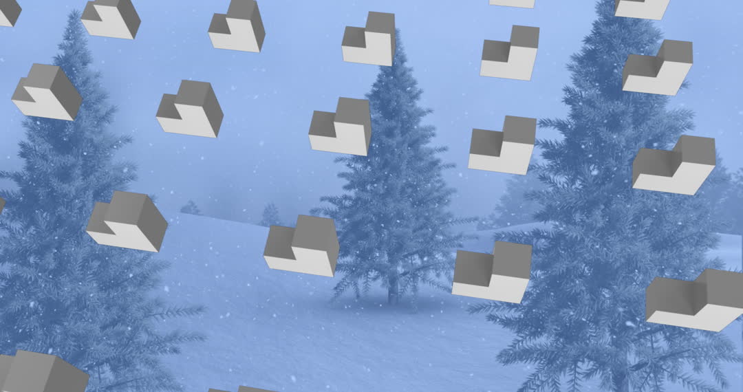 Rows of abstract geometric shapes float over a serene winter scene with snow-covered pine trees, creating a modern and festive atmosphere perfect for use in holiday-themed digital art displays or backgrounds in seasonal marketing.