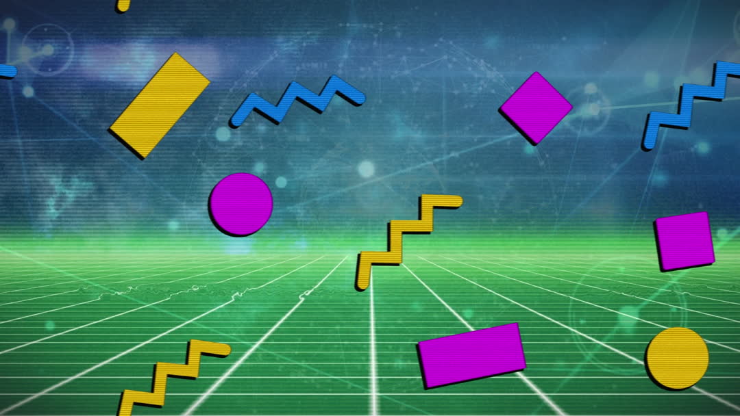 This video shows vibrant geometric shapes like rectangles, circles, and zigzags floating against a backdrop of dynamic financial data and digital connections. The mix of bright colors and technological motifs can be used in presentations or multimedia content emphasizing digital innovation, data analytics, or global connectivity themes.