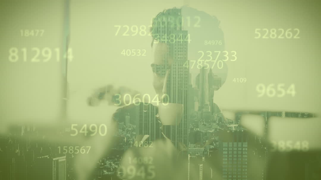 The video represents a blend of future-focused business and technology themes. The overlay of numerical data processing against a cityscape highlights a modern and urban work environment, perfect for discussing topics related to global finance, economic analysis, or innovative business concepts like smart cities. The depiction of a businessman drinking coffee suggests tenacity and reflective thinking, useful in illustrating analytical processes or corporate lifestyles.