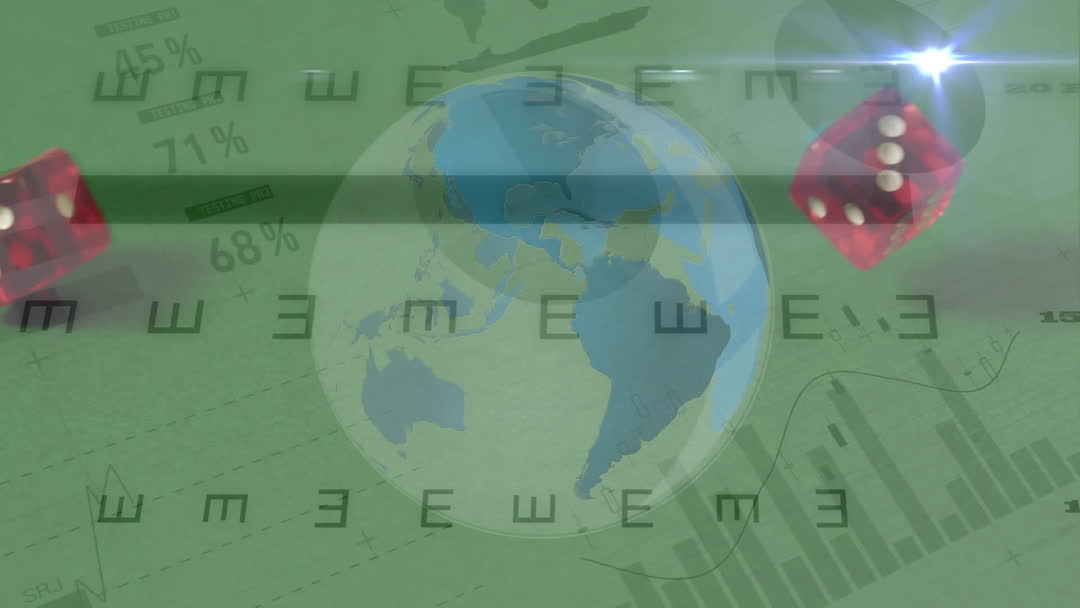 A digitally generated scene with a transparency layer showing Earth, financial figures, charts, and dice. The video conceptually illustrates global financial markets and gambling tendencies in stock investment, suggesting an uneasy relationship between risk and strategy. Use it for displays related to market analysis, financial advisories, education, or introductory frames in financial reports and presentations.