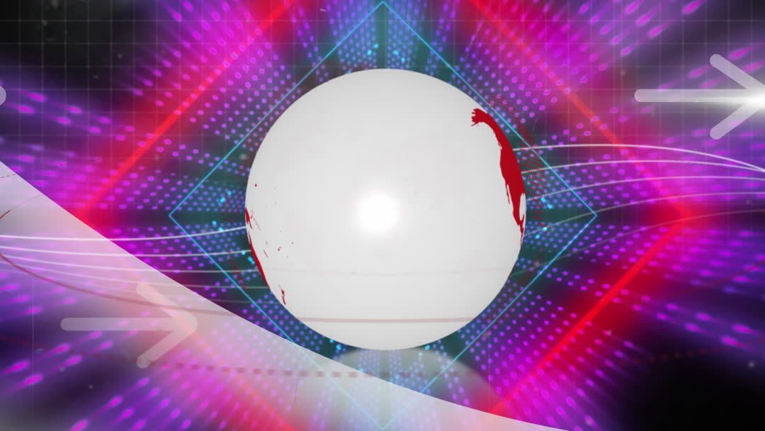 The video features an abstract representation of a global network with a sphere surrounded by vibrant neon lights and geometric patterns. The setting and vibrant colors suggest themes of international connections, digital networking, and data processing. This video is well-suited for illustrating concepts in technology, communication, and futuristic global interactions on websites, business presentations, or informational materials.