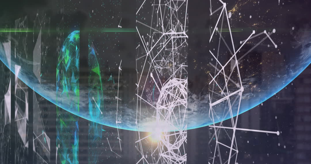 This abstract visualization displays concepts of a global network with futuristic design elements. The digital representation of earth and web of connections suggests international links and advanced technology interfaces. Ideal for presentations, webinars, or publications on global communication, digital transformation, or exploring digital realities.