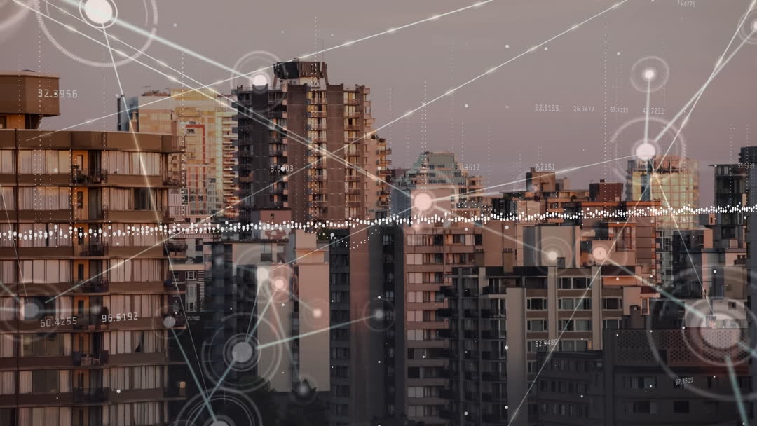 Modern city skyline with abstract digital overlay of graphs and network connections, symbolizing integration of technology, digital communication, and financial systems in contemporary urban environments. Useful for presentations on smart cities, technology, and financial services development or futuristic urban planning concepts.