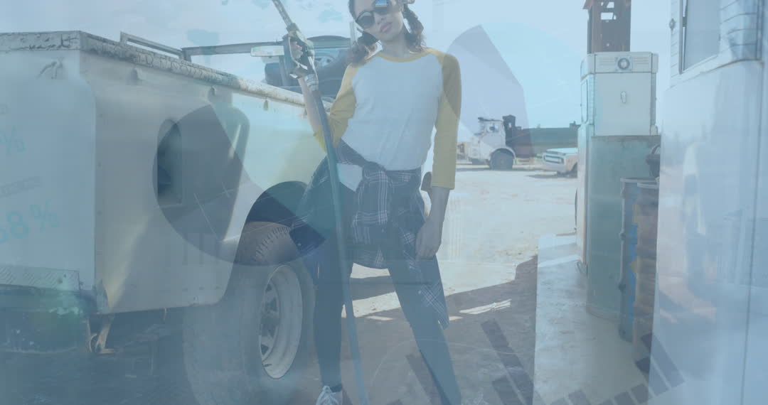 A digital composite showing a woman at a gas station with an overlay of abstract infographics. This blend of everyday life with technological design themes is perfect for concepts related to future retail, advanced financial interfaces, or global connectivity. Useful for illustrating innovative practices in service industries and the rising integration of digital data in daily tasks.