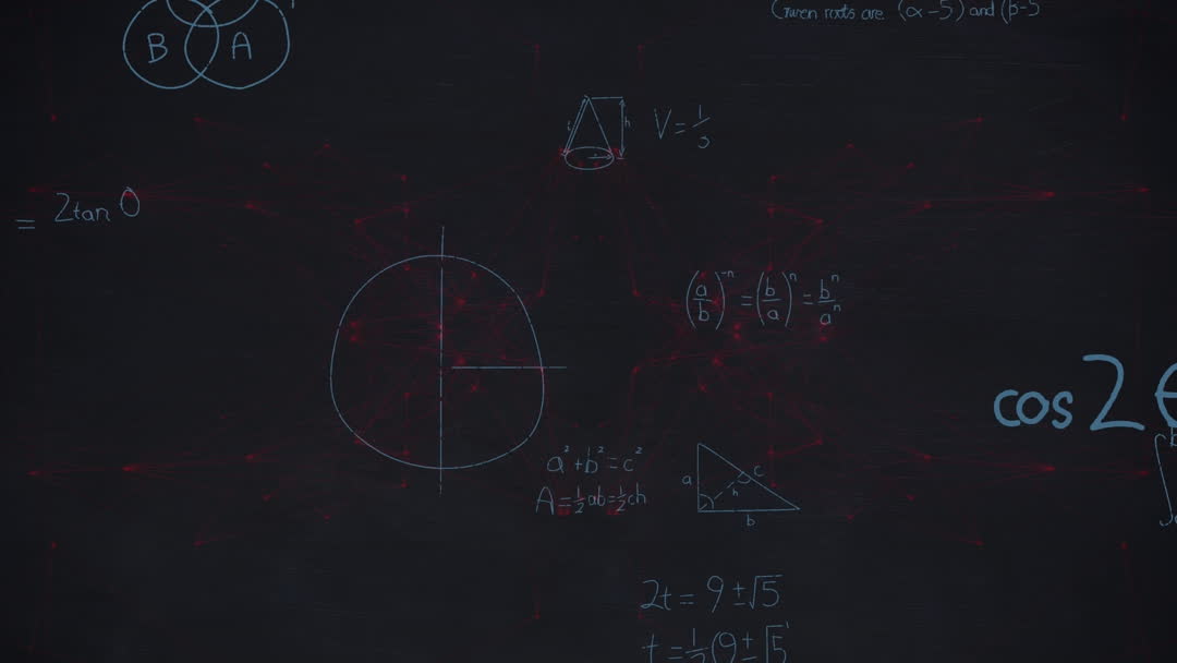 Abstract presentation of geometric and mathematical equations with a dark background. Ideal for conveying educational, academic, or scientific concepts. Can be used for presentations, educational videos, or as a digital background to signify technology-driven or analytical themes.