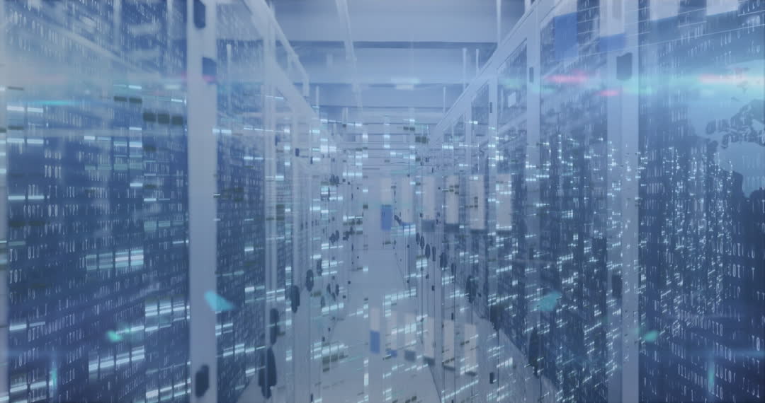 The artwork captures a futuristic view of server aisles with a dynamic overlay of data symbols and connections, illustrating the concept of global data exchange and digital processing. This is ideal for use in technology and IT industry presentations, cybersecurity visuals, or educational materials on digital infrastructure and cloud technology.