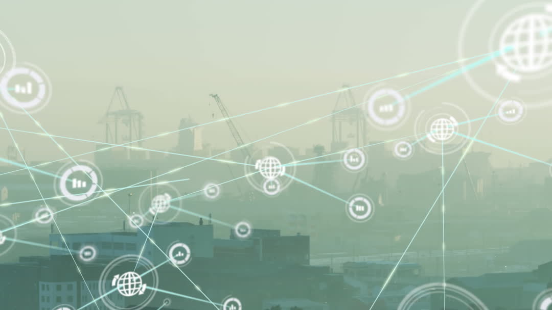 Animation showing digital connection interface over an industrial city landscape with fog and cranes. Useful for illustrating modern technology concepts, digital communications, and global connectivity. Ideal for any content related to digital innovation or industrial advancement.