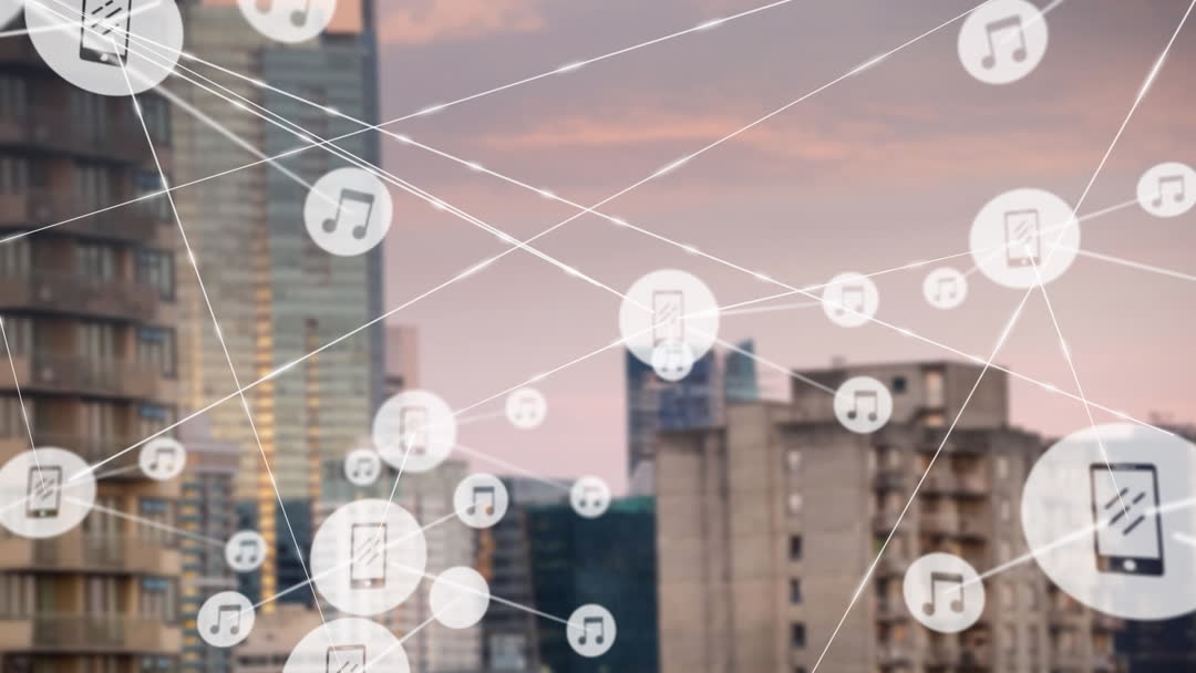 - Abstract Network of Digital Music Icons Over Urban Skyline