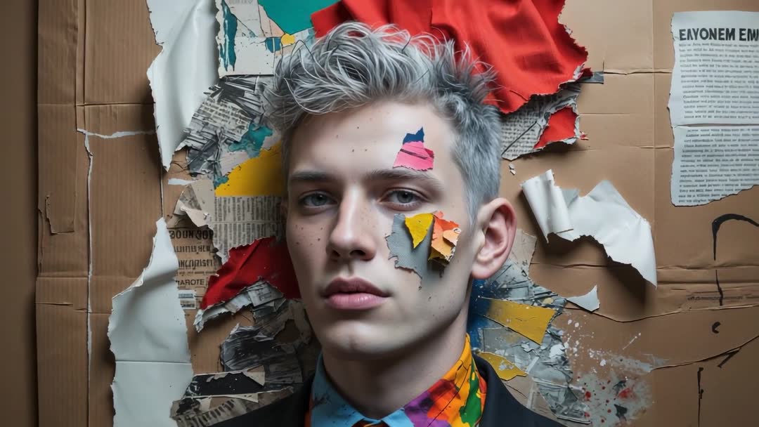 AI Generated Image. Model standing in front of an abstract torn cardboard collage. Bright colors and layered textures enhance creativity and contemporary flair. Ideal for concepts of self-expression, modern art displays, or illustrating avant-garde design ideas within artistic content.