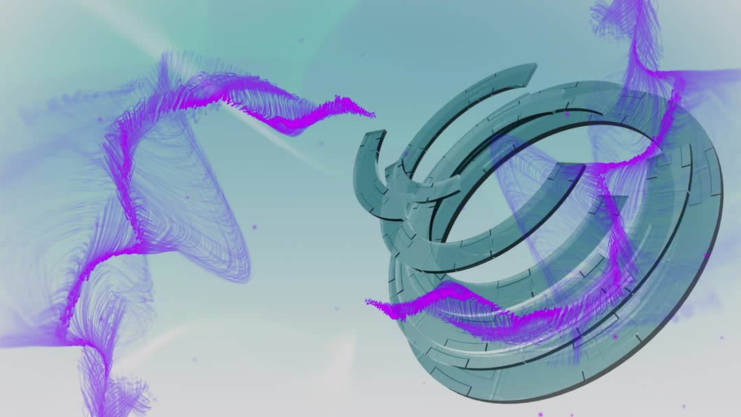 This digital animation showcases dynamic purple waveforms intersecting with metallic rings, all set against a calming green background. The use of bold colors and distinct shapes evokes a futuristic, technological atmosphere. Ideal for modern art displays, tech presentations, virtual screensavers, or design inspiration, this piece seamlessly captures motion and creativity.
