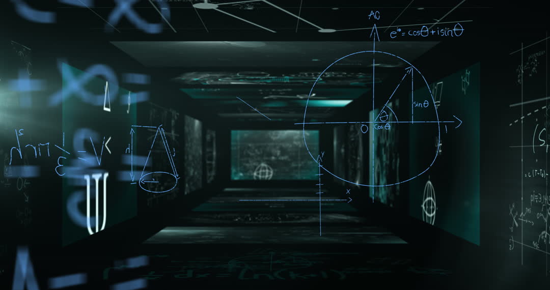Mathematical equations with light trails are depicted in a dark, digital interface setting, creating a mysterious and thought-provoking atmosphere. This animation is suitable for educational content, technology presentations, or illustrating concepts in science and mathematics. It can enhance articles about virtual learning and the role of mathematics in the digital age.