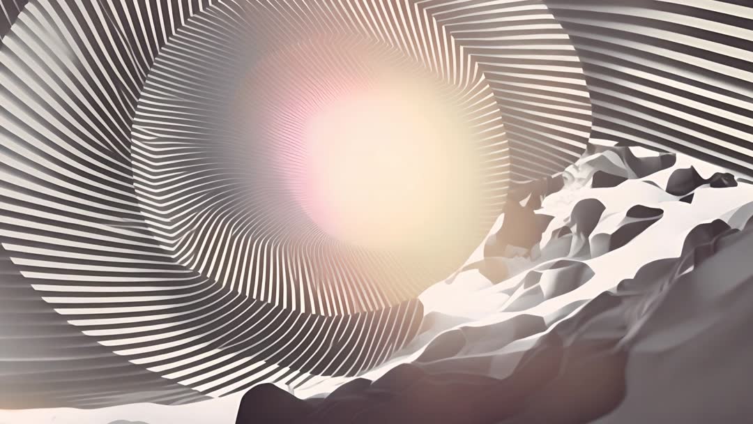 AI Generated Video. This digital artwork features a geometric spiral over a surreal, mountainous landscape, offering a blend of abstraction and modernism. Use in futuristic art collections, digital design projects, or as a creative backdrop. Ideal for visual projects highlighting abstract themes and contemporary aesthetics.