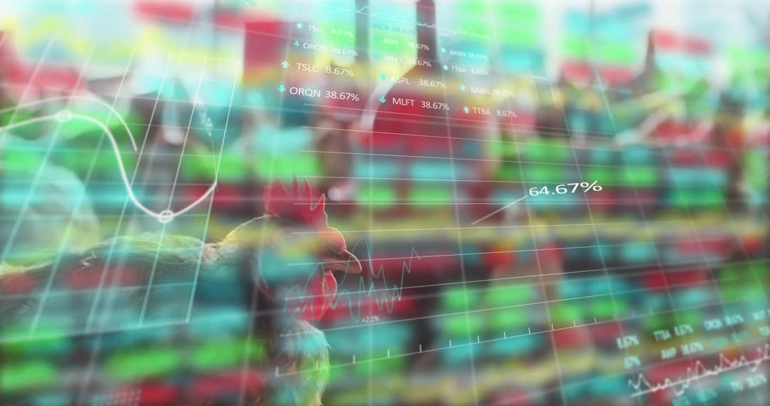 Image combines elements of finance with a rooster, creating a symbolic interaction of animal with digital financial data. Ideal for presentations on innovation in finance, like fintech apps, analyses, or forward-thinking economic strategies. Visually represents convergence of traditional concepts with modern technology.